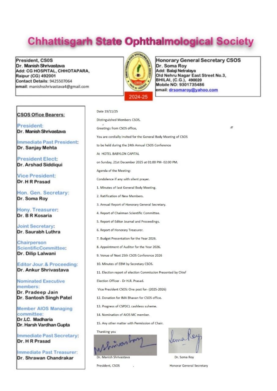 | 5. | Notice - General Body Meeting of CSOS - 21st Annual CSOS Conference at Raipur | Download |